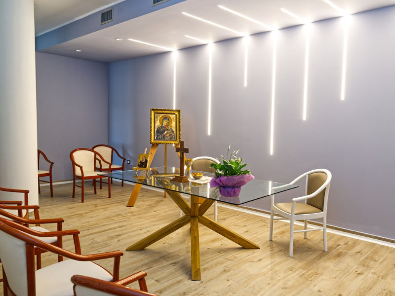 La Struttura offre una palestra ampiamente dotata di attrezzature e macchinari, indispensabili sia per la ginnastica dolce che per la rieducazione funzionale. Completa il piano inferiore un moderno e avveniristico luogo di culto.